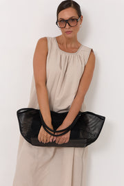 The Sporty Weave Tote features top handles and a mesh weave design with a flat base. It’s finished with a magnetic clip closure and includes a canvas pouch with internal pockets.