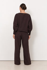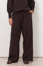 The Stevie Pant in Chocolate is crafted from a lightweight lyocell–linen blend. Designed with a drawstring waistband, relaxed straight leg and side seam pockets.