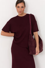 The Taylor Rib Knit Midi Skirt in Burgundy features a ribbed knit construction with a midi-length silhouette. Designed with an elasticated waistband and stretch fabrication.