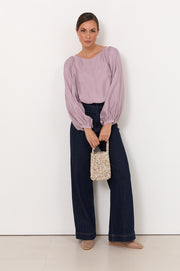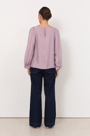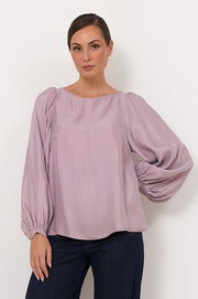 The Ulla Boat Neck Cupro Top in Lilac features a boat neckline and is cut from soft cupro. Designed with long sleeves finished with buttoned cuffs, a straight hem, and a button and loop closure at the back.