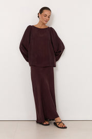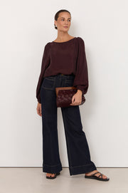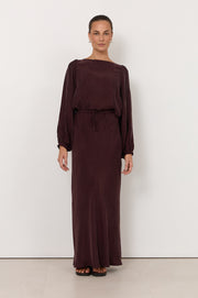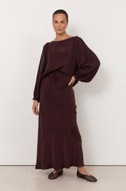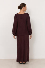 The Ulla Boat Neck Cupro Top in Plum features a boat neckline and is cut from soft cupro. Designed with long sleeves finished with buttoned cuffs, a straight hem, and a button and loop closure at the back.