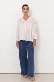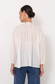 The Winnie Top in White is crafted from 100% cotton and features a V-neckline with a button-down front and self-covered buttons. Designed with a ruched finish and long sleeves with elasticated cuffs, it has a sheer, lightweight feel.