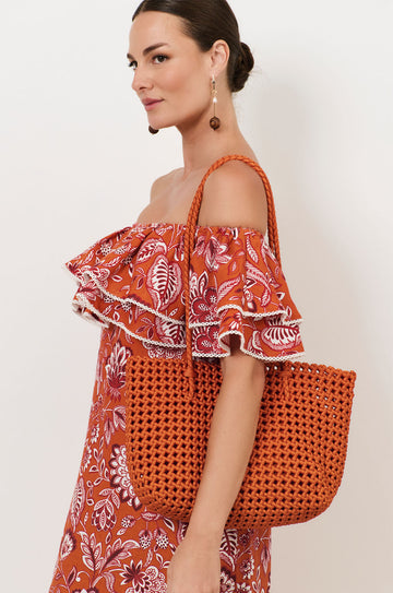 The Woven Satin Tote in Orange is a spacious tote featuring a woven satin design with top handles and an open top. Finished with a magnetic closure and a matching pouch.