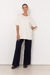 The Yvonne Knit Skirt in White features a ribbed knit construction with an A-line silhouette. Designed with a thick elasticated waistband for a relaxed fit.